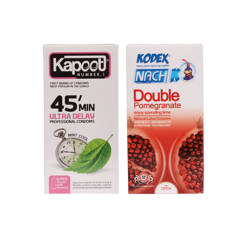 کاندوم کاپوت مدل 45min بسته 12 عددی به همراه کاندوم ناچ کدکس مدل Double Pomegranate بسته 12 عددی