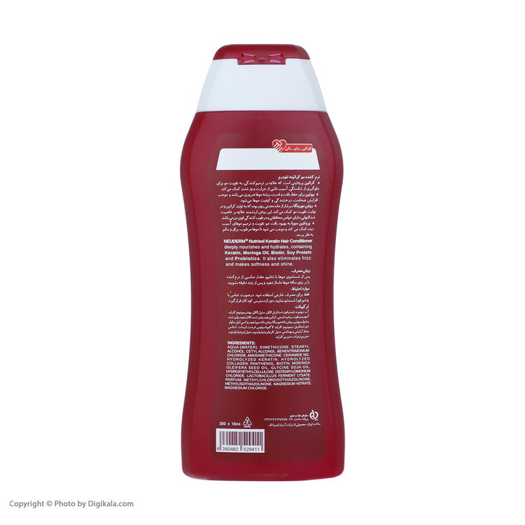 نرم کننده موی کراتینه فاقد سولفات نوتریسل نئودرم حاوی کراتین، روغن مورینگا، بیوتین، پروتئین سویا و پروبیوتیک است. این محصول با تغذیه و آبرسانی عمیق موها، لطافتبخش و بازکننده گره آنها بوده و حالت فر و وزی موها را از بین میبرد و موجب نرمی، لختی، براقی و درخشندگی آنها میشود. نرم کننده کراتینه نئودرم مناسب برای موهای وز، فر، خشک، آسیب دیده و افرادی که موهای خود را به وسیله کراتینه کردن، صاف کردهاند است. کراتین پروتئینی است که به تقویت مو برای جلوگیری از شکستگی، آسیب گرما و وز شدن کمک میکند. این ماده علاوه بر ترمیم کنندگی موها را در برابر آسیبهای محیطی حفظ میکند. بیوتین برای حفظ بافت و قدرت ریشه موها مناسب است. این ماده علاوه بر کمک به رشد مجدد مو، موجب افزایش ضخامت، درخشندگی و کیفیت موها میشود. روغن مورینگا موجود در نرم کننده کراتینه فاقد سولفات نئودرم، سرشار از ماده معدنی روی است که به تولید کراتین و در نهایت، تقویت موها کمک شایانی میکند. این روغن ارزشمند علاوه بر خاصیت ضد التهابی، دارای خواص محافظتی و مرطوبکنندگی قوی است. پروتئین سویا به بهبود بافت مو، تقویت و ترمیم موهای آسیب دیده کمک میکند و موجب میشود موها مرطوب، براق و سالم باشند. ویتامین B نقش مهمی در حفظ سلامتی و رشد موها دارد و با جلوگیری از آسیبهای ناشی از رادیکالهای آزاد، به بهبود سلامت آن کمک میکند. پروبیوتیکها همانند واکسن، سیستم ایمنى سلولى را فعال کرده و ضمن تولید مواد ضد التهابى، با حفظ اسیدیته پوست و مو به بهبود وضعیت آنها کمک میکند.