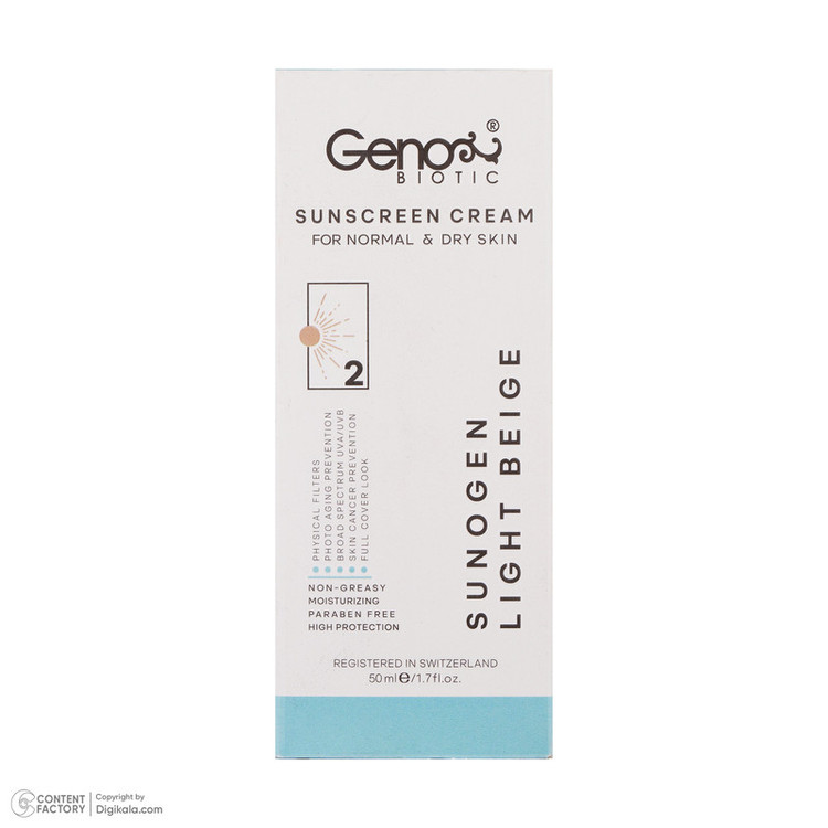 کرم ضد آفتاب مخصوص پوست های خشک و معمولی ژنوبایوتیک، با دارا بودن فیلترهای UV و همچنین مواد موثره گیاهی، نقش موثری در مهار اثرات مضر پرتوهای UVA و UVB دارد. بافت این کرم برای پوست های خشک و معمولی طراحی شده، که علاوه بر ایجاد پوشش کامل بر روی پوست، به حفظ رطوبت و تازگی پوست کمک نموده و با دارا بودن بافت سبک، مانع از پیری زودرس و ایجاد چین و چروک پوستی می شود.