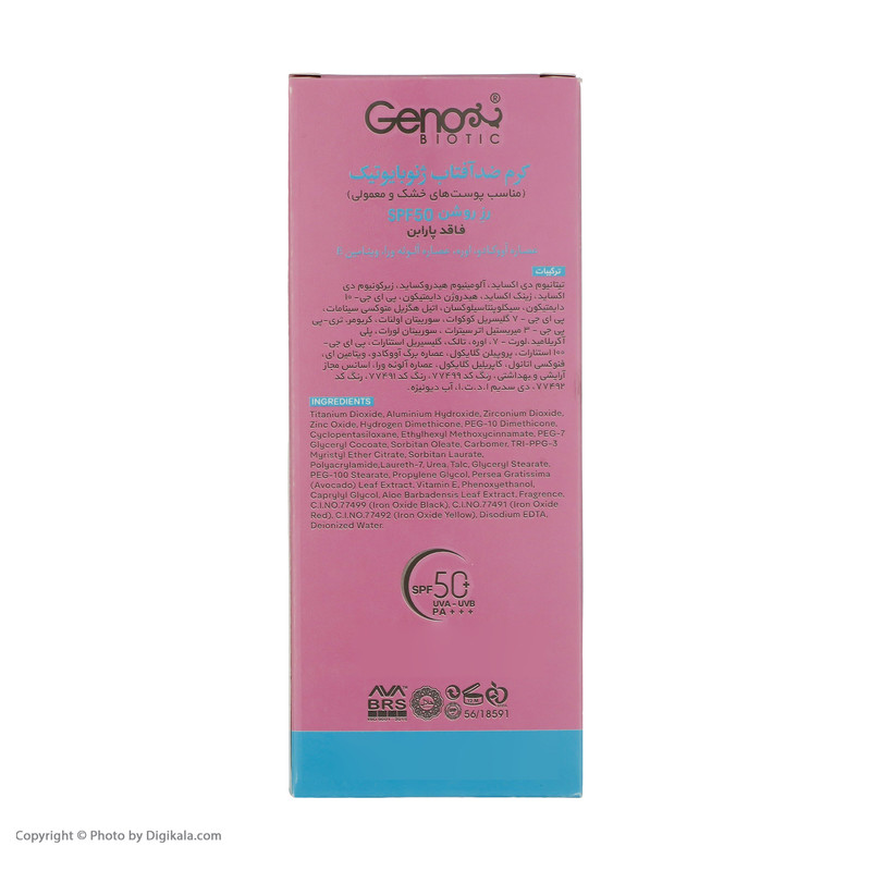 کرم ضد آفتاب رنگی ژنوبایوتیک مخصوص پوستهای خشک و معمولی، با دارا بودن فیلترهای UV و همچنین مواد موثره گیاهی، نقش موثری در مهار اثرات مضر پرتوهای UVA و UVB دارد. بافت این کرم برای پوستهای خشک و معمولی طراحی شده، که علاوه بر ایجاد پوشش و کاور کامل بر روی پوست، به حفظ رطوبت و تازگی پوست کمک نموده و با دارا بودن بافت سبک، مانع از پیری زودرس و ایجاد چین و چروک پوستی میشود. این کرم میتواند جایگزین کرم پودر روزانه باشد.