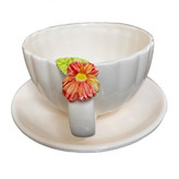 فنجان و نعلبکی سرامیکی مدل گل برجسته دست ساز محصول کاسه کوزه (دست ساز) است. این فنجان و نعلبکی منحصر بفرد و جذاب با رنگ آمیزی زیبا و با طرح گل برجسته که فوق العاده فنجان و نعلبکی را زیبا و خاص کرده است. تکنیک نقاشی زیر لعابی انجام شده و جنس آن سرامیکی و قابل شستشو است. لعاب استفاده شده در این ظرف لعاب اف 38 است(لعاب قلیایی و بدون سرب)و در دمای 1080تا 1100 درجه پخته شده و طی فرآیندی چند روزه هر بار به مدت 12 ساعت دو تا سه بار وارد کوره شده است. این محصول برای کسانی که ضمن علاقه به انتخاب های خاص که نظیر آن کمتر در خانه ای دیده شده است، یک انتخاب فوق العاده خواهد بود. سرامیک انتخاب شده در ساخت این ظروف و رنگ طبیعی بکار رفته برای زیبایی بخشی به آنها ، ضمن تضمین کیفیت بی رقیب این محصول. ارتفاع این فنجان و نعلبکی 7 و قطره دهانه آن 10سانتی متر است. رنگ های استفاده شده در این فنجان و نعلبکی ، کاملا طبیعی بوده و از رنگ های خوراکی و مجاز است بنابراین می توانید نوشیدنی های خوشمزه ی خود را با خیال راحت در آن میل نمایید بدون آنکه نگران سمی بودن آنها باشید. با توجه به جنس سرامیکی این محصول ، نوشیدنی شما خیلی زود سرد نمی شود. توجه کنید که این کار کاملا دست ساز و کار کارخانه ای و تیراژی نیست.