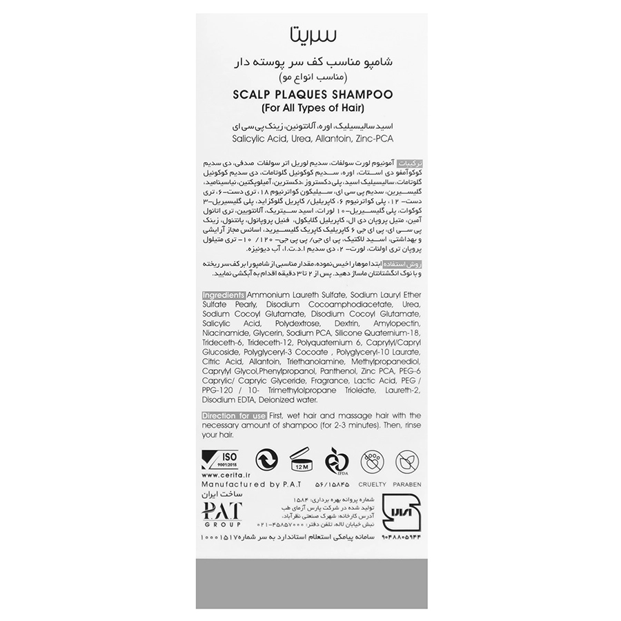 ملاحظات: شامپو پسوریازیس سریتا قابل استفاده افراد با انواع مو از سن 12 سال به بالا است. شامپو پسوریازیس سریتا برای افرادی که دارای علائم پسوریازیس هستند و افرادی که تصمیم دارند بیماری خود را تحت کنترل قرار بدهند، قابل استفاده است. کودکان و نوزادان تنها به توصیه پزشک می توانند از این شامپو استفاده کنند. از مصرف شامپو پس از تاریخ انقضاء خودداری کنید.