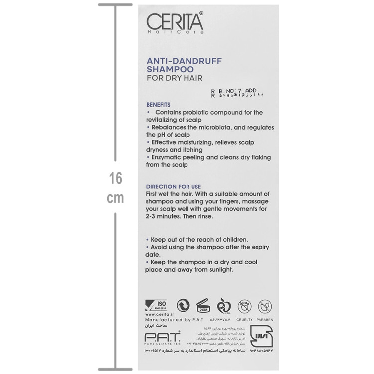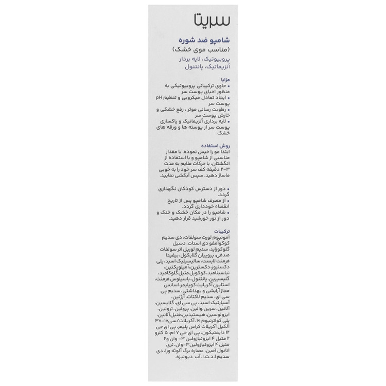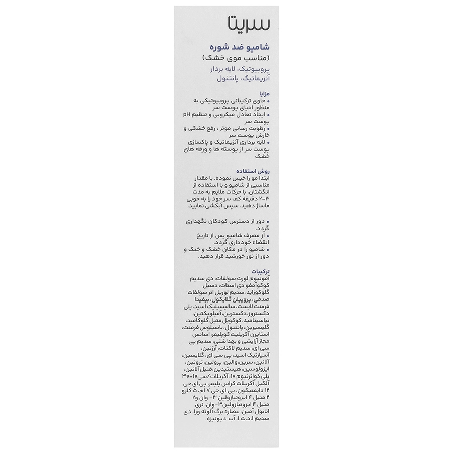 شامپو سریتا ضد شوره برای موهای خشک تولید شده در حجم 200 میلی لیتر: .
