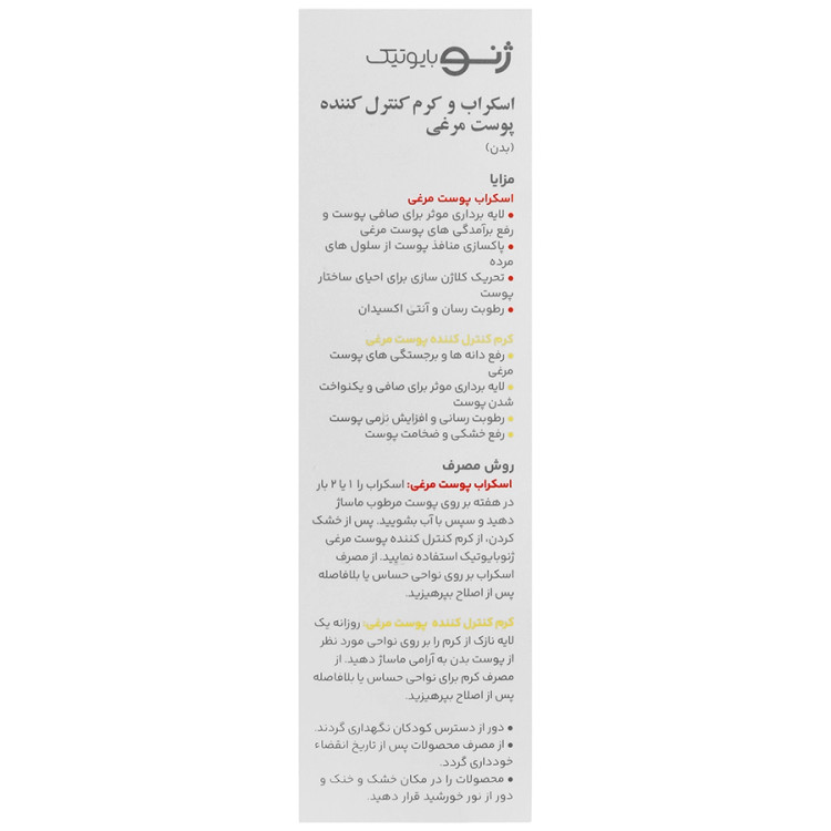 روش مصرف:اسکراب پوست مرغی: اسکراب را 1 یا 2 بار در هفته بر روی پوست مرطوب ماساژ دهید و سپس با آب بشویید. پس از خشک کردن، از کرم کنترل کننذه پوست مرغی ژنوبایوتیک استفاده نمایید. از مصرف اسکراب بر روی نواحی حساس یا بلافاصله پس از اصلاح بپرهیزید.