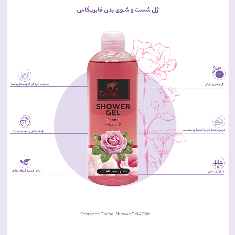 حاوی ویتامین F با رایحه گیاهی درمانیِ آرامشبخش و ضد حساسیت قدرت تمیز کنندگی مناسب ایجاد حس طراوت و شادابی مناسب بانوان و آقایان برای انواع پوست زدودن آلودگی های سطح پوست پاک کننده غیر صابونی ، ضد تعریق و بو آبرسان پوست و جلوگیری از خشکی پوست تسهیل جوان سازی پوست همراه با لطافت و نرمی پوست بوی ملایم این ژل دوش با عطر شنل مورد پسند سلیقههای مختلف خواهد بود. مزیت شستوشوی بدن با این ژل، خوشبو شدن بدن تا ساعتها پس از استحمام می باشد. طریقه مصرف: مقدار مناسبی از این ژل را روی یک لیف نرم ریخته سپس روی پوست مرطوب بمالید. بعد از دو دقیقه با آب ولرم شستشو نمایید.