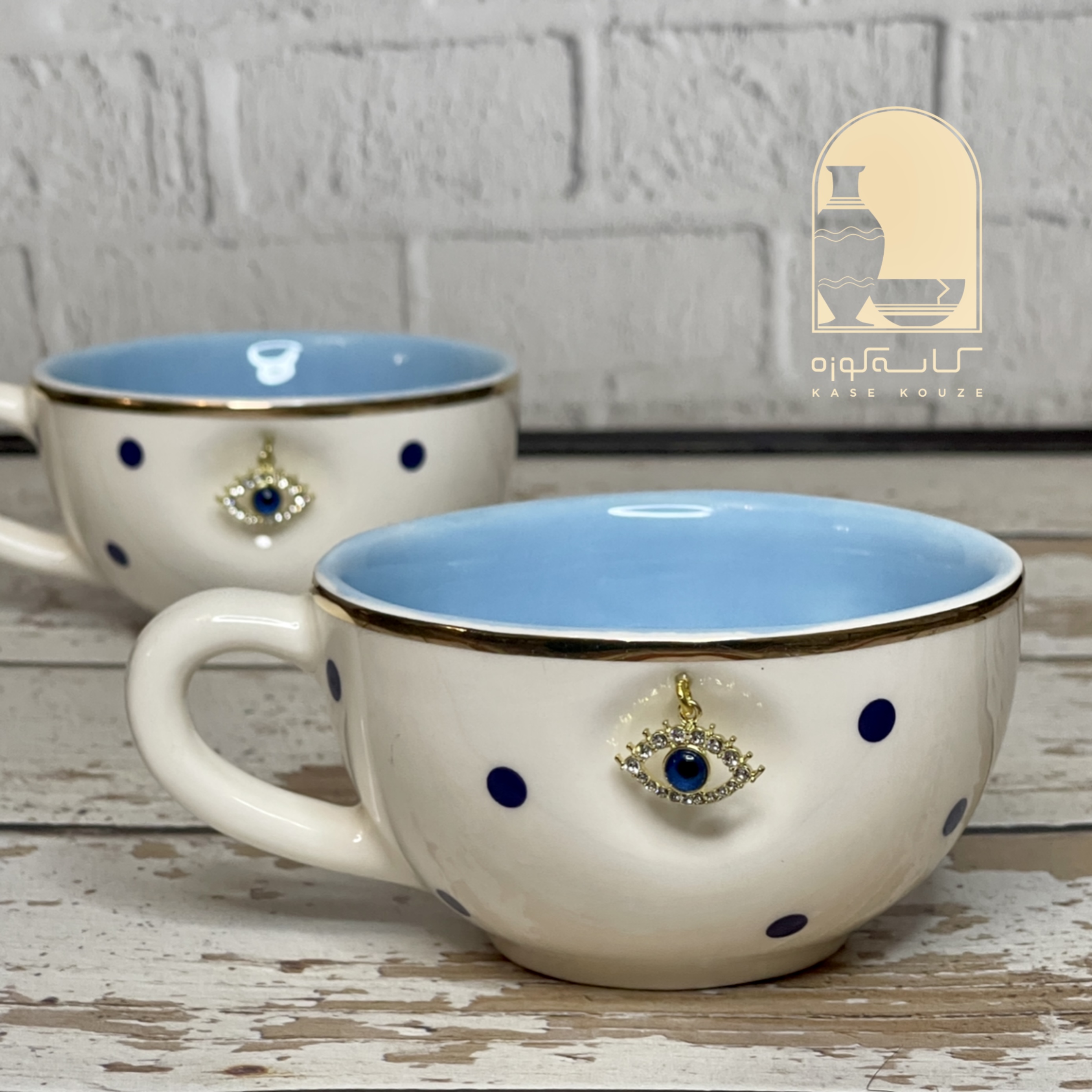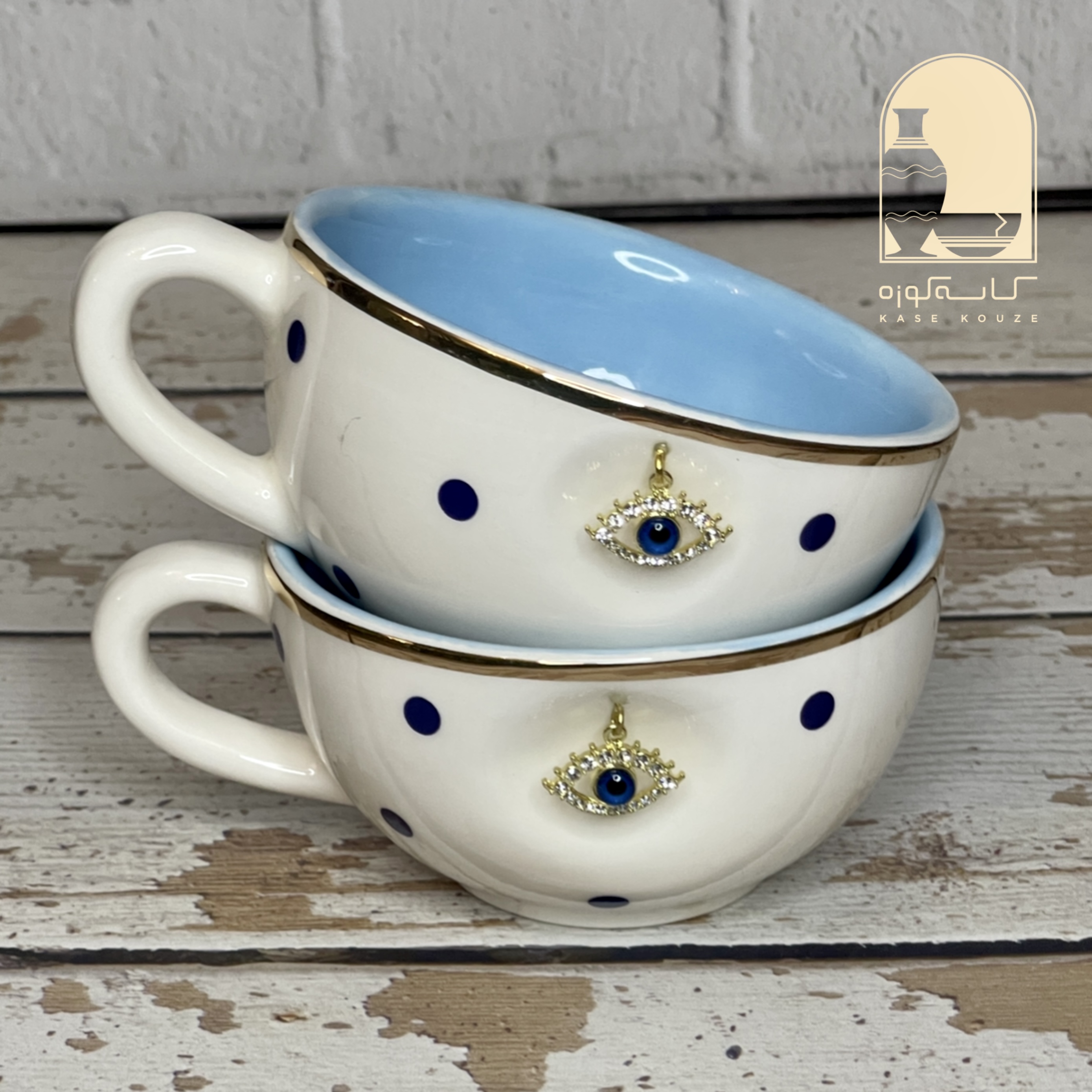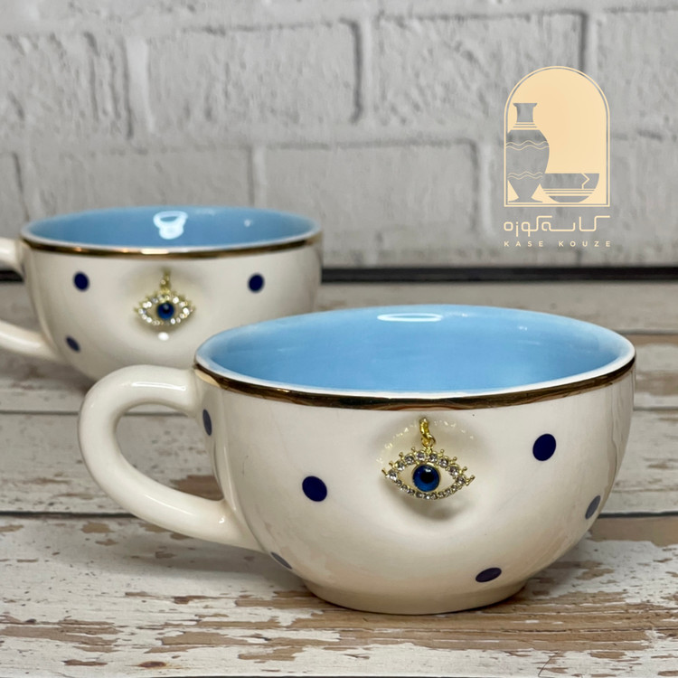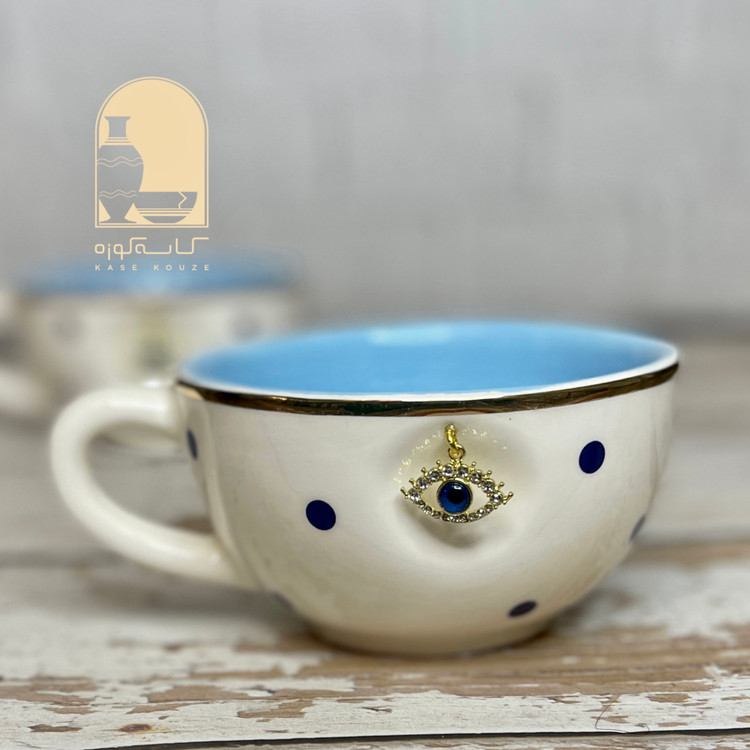 فنجان سرامیکی آویز چشم نظر تزئین شده با طلای 11 عیار در لبه های فنجان . این محصول دست ساز میباشد 3 مرحله در کوره و در دمای 1100 درجه پخت شده و با تحمل شک حرارتی بالا این محصول رنگ . لعاب . طرح و نقش ثابت و کاملا براق و با کیفیت می باشد این محصول دارای یه پلاک آویز چشم نظر میباشد که قشنگی آن را چند برابر کرده این محصول قابل شستشوی است و این محصول بدون کوچکنرین لب پری و ترک و لک میباشد و کاملا براق است