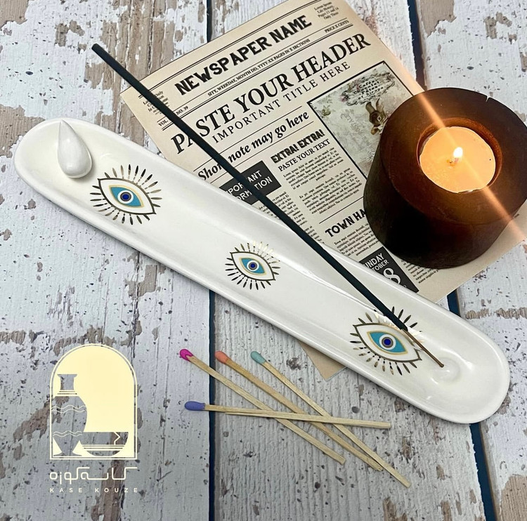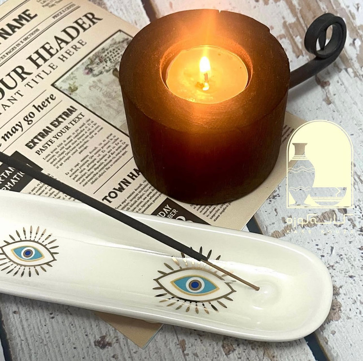 جا عودی سرامیکی طرح چشم نظر تزئین شده با طلای 11 عیار . این محصول دست ساز میباشد 3 مرحله در کوره و در دمای 1100 درجه پخت شده و با تحمل شک حرارتی بالا این محصول رنگ . لعاب . طرح و نقش ثابت و کاملا براق و با کیفیت می باشد این محصول قابل شستشوی است و این محصول بدون کوچکنرین لب پری و ترک و لک میباشد و کاملا براق است