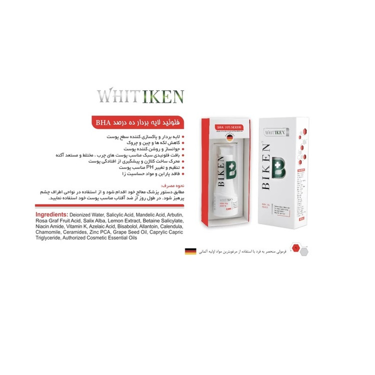 دیدن محصولات مرتبطفلویید لایه بردار ده درصد BHA بیکن پلاس یکی از بهترین محصولات ایرانی میباشد ایه بردار و پاکسازي کننده سطح پوست کاهش لکه ها و چین و چروك باعث جوانساز و روشن کننده پوست باعث بافت فلوئیدي سبک مناسب پوست هاي چرب ، مختلط و مستعد آکنه باعث محرك ساخت کلاژن و پیشگیري از افتادگی پوست باعث تنظیم و تغییر PH مناسب پوست فاقد پارابن و مواد حساسیت زا میباشد