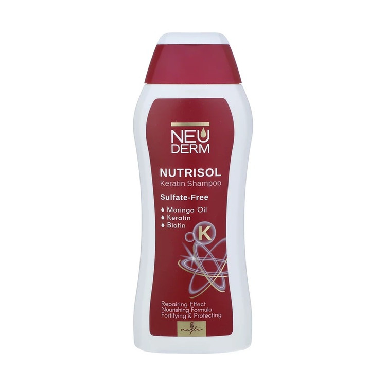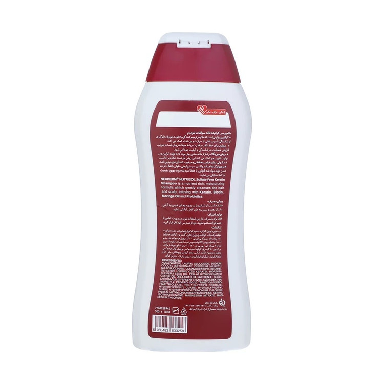 شامپو سر کراتینه فاقد سولفات نوتریسل نئودرم یک فرمول غنی از مواد مغذی، بدون سایش و مرطوب کننده است که موها و پوست سر را به آرامی تمیز میکند. این شامپو حاوی کراتین سرشار از مواد مغذی و آبرسان همچون بیوتین، روغن مورینگا و پروبیوتیک ها است که تغذیه و محافظت شدید از مو و پوست سر را فراهم میکند. در ادامه با فواید هر کدام آشنا میشویم: کراتین پروتئینی است که به تقویت مو برای جلوگیری از شکستگی، آسیب گرما و وز شدن کمک میکند. این ماده علاوه بر ترمیم کنندگی موهایی که با گرما و رنگ خشک شدهاند، آنها را در برابر آسیبهای بیشتر حفظ میکند. بیوتین برای حفظ بافت و قدرت ریشه موها ضروری است. این ماده موجود در شامپو کراتین نئودرم علاوه بر کمک به رشد مجدد مو، موجب افزایش ضخامت، درخشندگی و کیفیت موها میشود. روغن مورینگا در شامپو کراتینه فاقد سولفات نئودرم سرشار از ماده معدنی روی است که به تولید کراتین و در نهایت تقویت مو کمک میکند. این روغن ارزشمند علاوه بر خاصیت ضد التهابی، دارای خواص محافظتی و مرطوب کنندگی قوی است. پروبیوتیکها همانند واکسن، سیستم ایمنى سلولى را فعال کرده و ضمن تولید مواد ضد التهابى، با حفظ اسیدیته پوست و مو، به بهبود وضعیت آنها کمک شایانى مىنمایند.