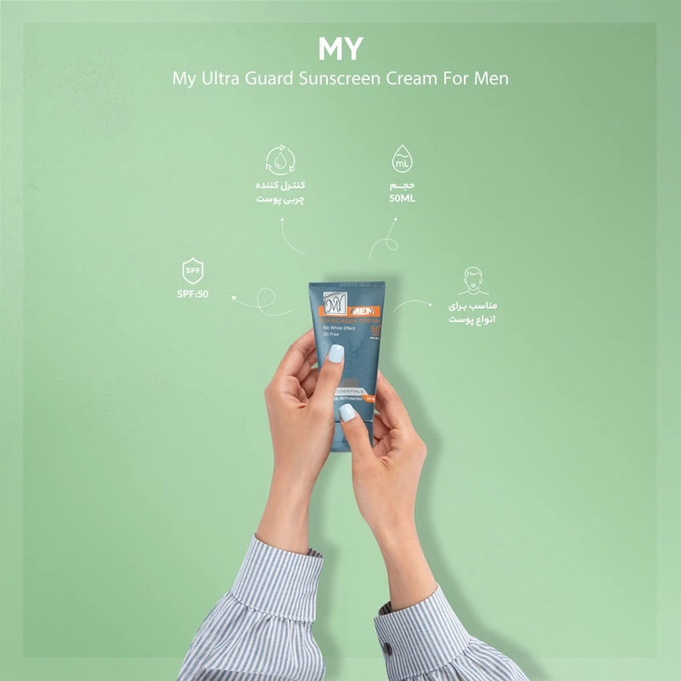 کرم ضد آفتاب مردانه بدون رنگ مای مدل Ultra Guard محافظ UVA ،UVB، مناسب انواع پوست حجم 50 میلیلیتر
