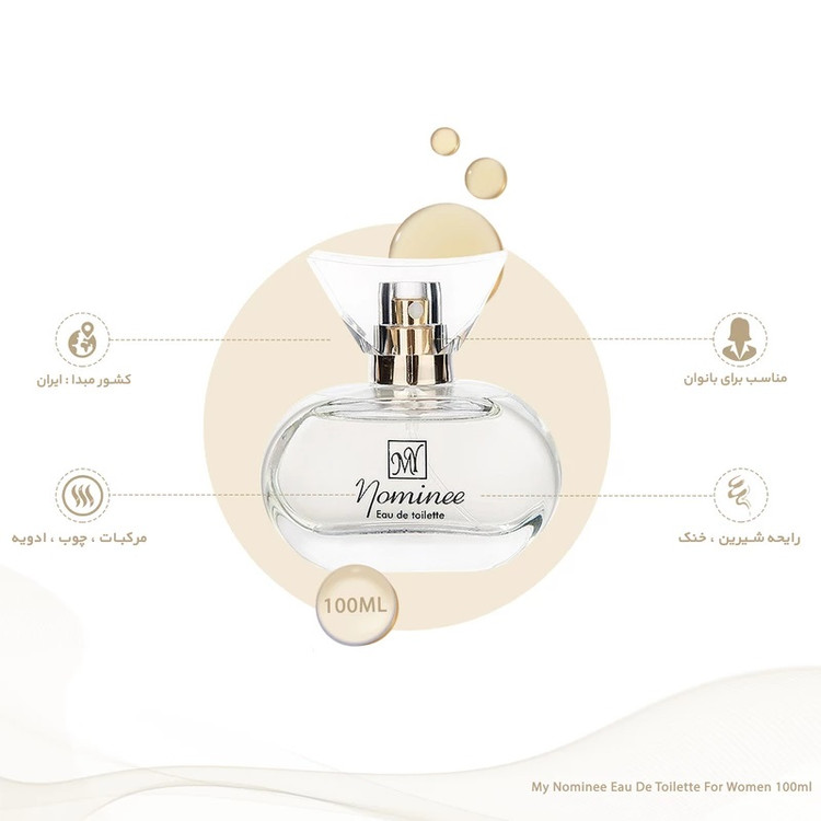یکی از حواس پنجگانهی ما که طی روز بهطور مداوم و فعال محیط اطراف را پردازش میکند، حس بویایی است. از طریق حس بویایی محیط اطراف با ما ارتباط برقرار کرده و میتواند حس خوشایند یا ناخوشایندی را به ما القا کند. از آنجاییکه بوی خوش میتواند هم به ما و هم به افرادی که طی روز با آنها در تعامل هستیم، حس خوشایندی منتقل کند، انتخاب یک عطر مناسب اهمیت پیدا میکند. ادو تویلت «نومنی» (Nominee) از عطرهای MY است که برای بانوان و در حجم 100 میلیلیتر تولید شده و ساختار این عطر را چوب، گیاهان معطر، گل تشکیل میدهد. در ابتدای استفاده بوی اسطوخودوس و لیلیوم را حس میکنید که پس از مدتی جای خود را به گل موگه میدهد. این نت نیز ماندگار نیست و با گذشت زمان خواهید دید که از بین میرود و مشک و سدر تثبیت میشود.