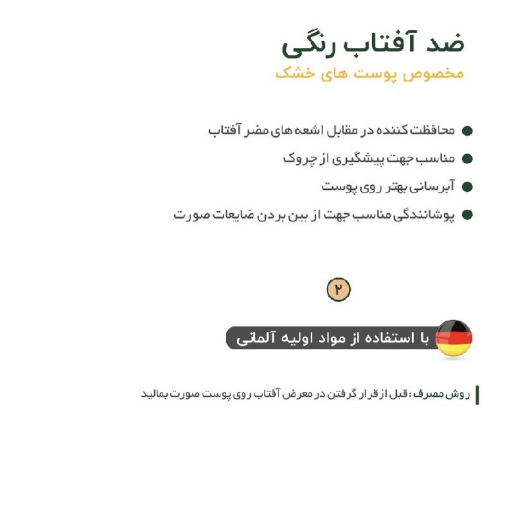 دیدن محصولات مرتبطاین محصول محافظت کننده در مقابل اشعه هاي مضر آفتاب مناسب جهت پیشگیري از چروك آبرسانی بهتر روي پوست پوشانندگی مناسب جهت از بین بردن ضایعات صورت این محصول استفاده از بهترین مواد آلمانی میباشد