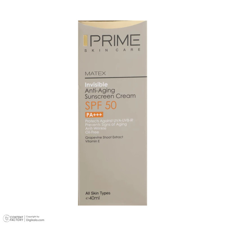 کرم ضد آفتاب و ضد چروک بی رنگ پریم مدل Matex COLORLESS spf 50 مناسب انواع پوست حجم 40 میلی لیتر