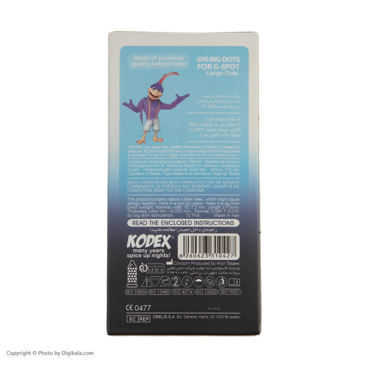 سایر توضیحاتآغشته به ماده روان کننده دارای خارهای درشت در سراسر کاندوم دارای منبع ذخیره در ابتدای کاندوم کاملا ایمن